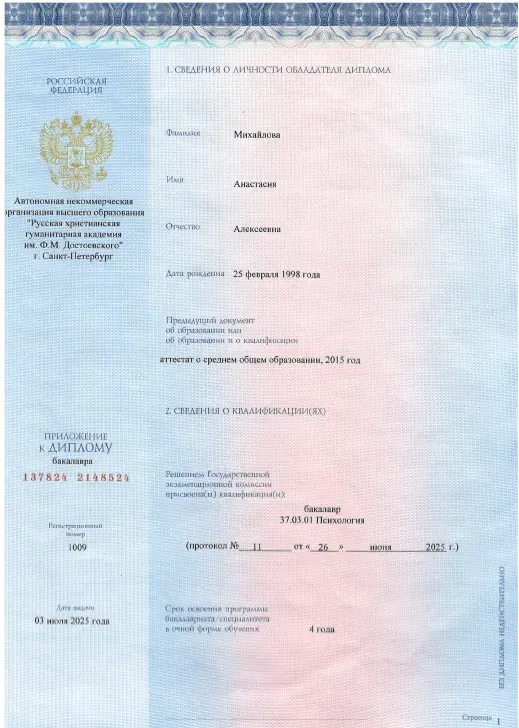 Анастасия Алексеевна — практикующий психолог с опытом более 5 лет в частной практике и более 2 лет работы в реабилитационном центре для зависимых.