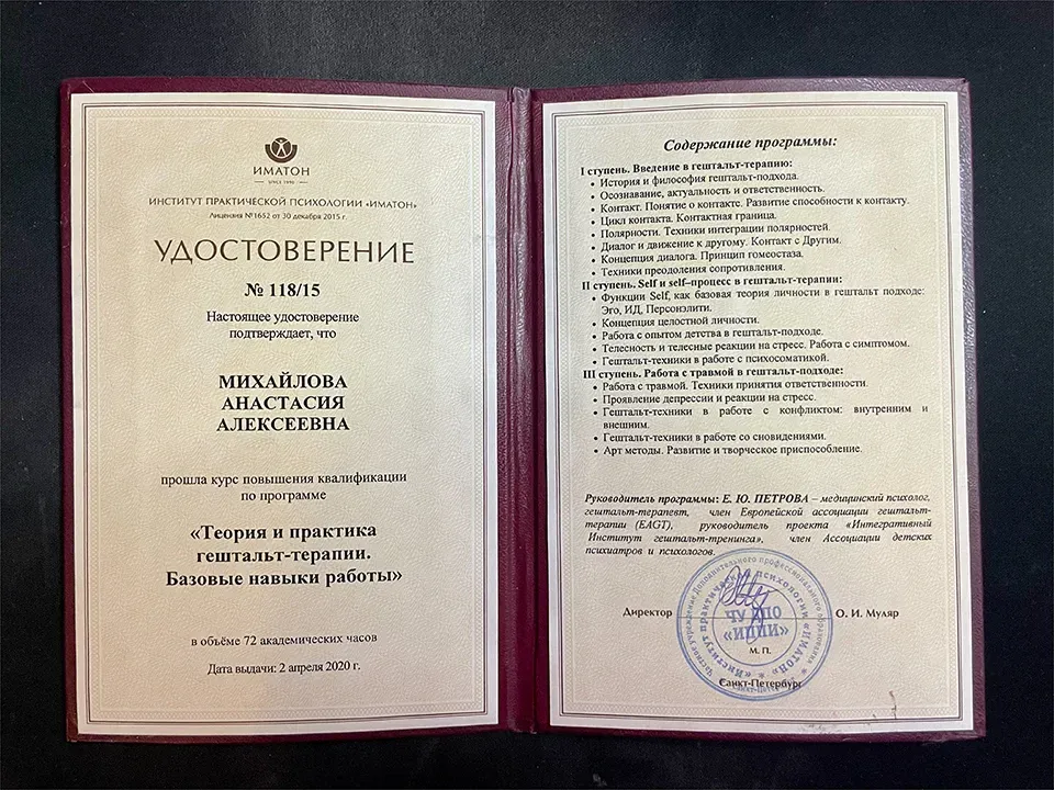 Анастасия Алексеевна работает в рамках интегративной психотерапии, что позволяет ей подбирать наиболее эффективные методы для каждого конкретного клиента. Она убеждена, что комплексный подход даёт более глубокие и устойчивые результаты.